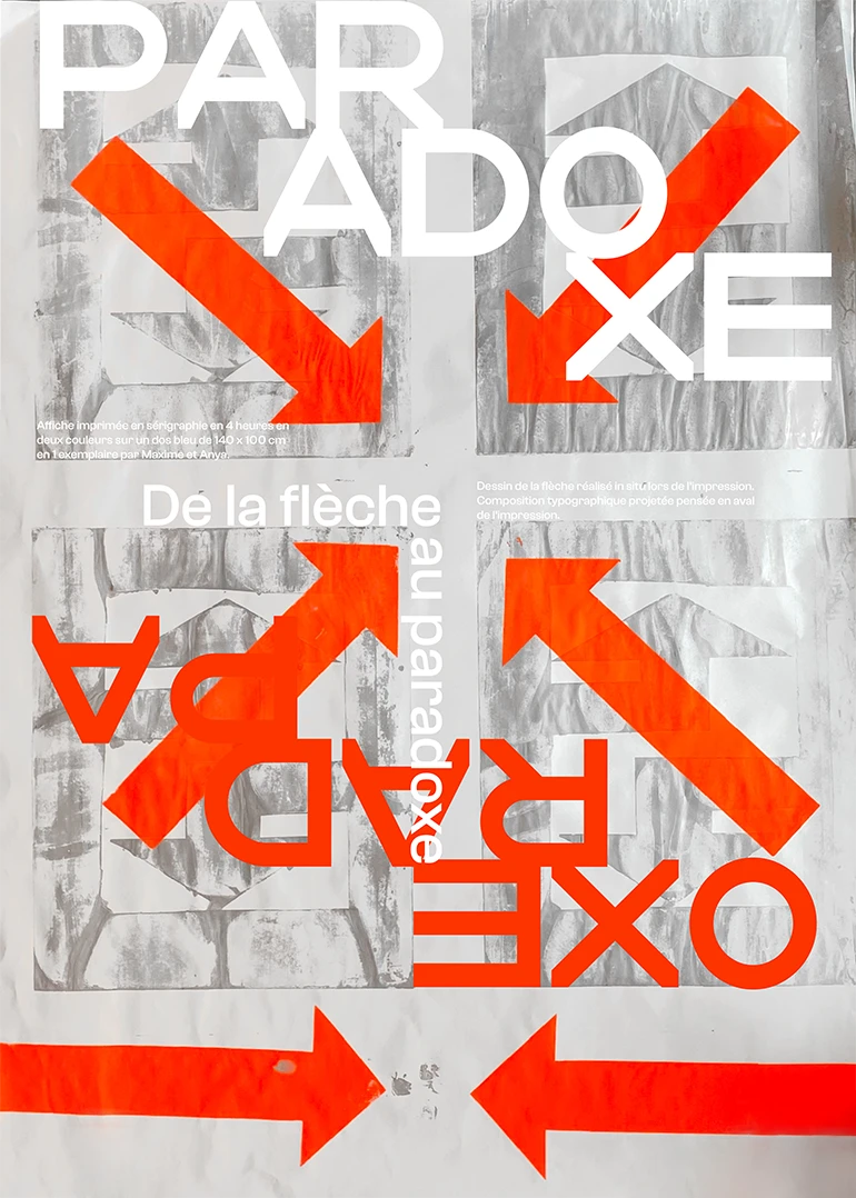 Conception d'une affiche sérigraphiée avec comme élément central, la [les] flèche[s], tournée[s] autour de la thématique du paradoxe. Réalisée avec Anya Romanenko